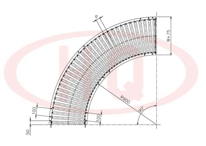 | 型 號 | 滾筒外徑(φ)×壁厚(t) 軸承 | 軸外徑(φ)×壁厚(t) | 支架形狀I×K×t 輸送機高 (H) | 機 長 L | 滾 筒 幅 寬 W | 滾筒間距 P | 轉彎半徑 | ||||||